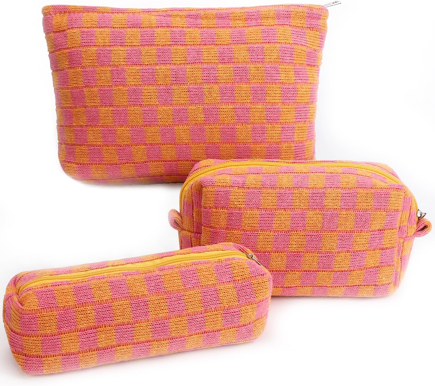3 Pcs Makeup Bag Checkered Cosmetic Bag Large Capacity Traveling Toiletry Pounch Organizer Cute Makeup Brushes Aesthetic Accessories Storage Bag for Girls Women(Orange-Purple)