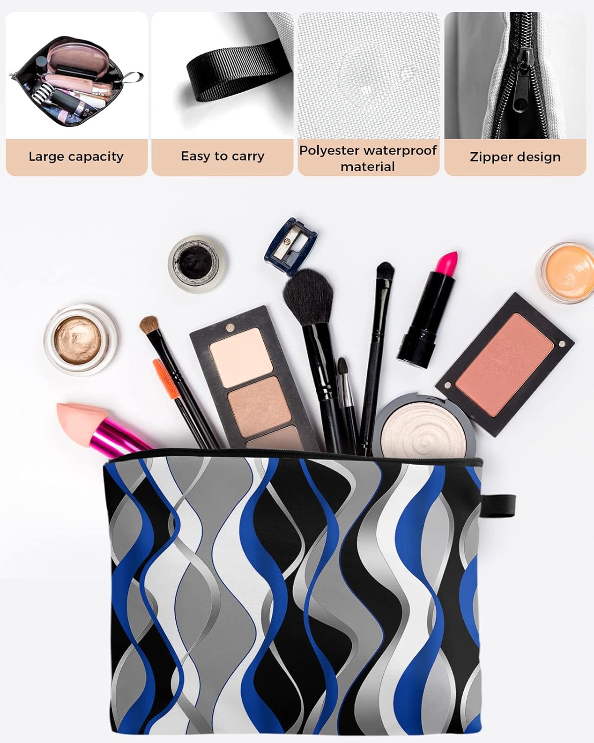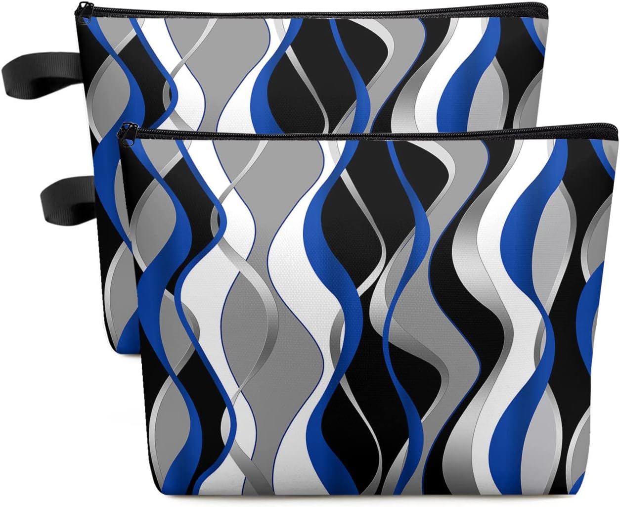 Abstract Geometric Cosmetic Bags for Women, Blue Stripe Black Grey Wavy Line Small Makeup Bag for Purse, Waterproof Travel Toiletry Bag Accessories Organizer, 2PCS