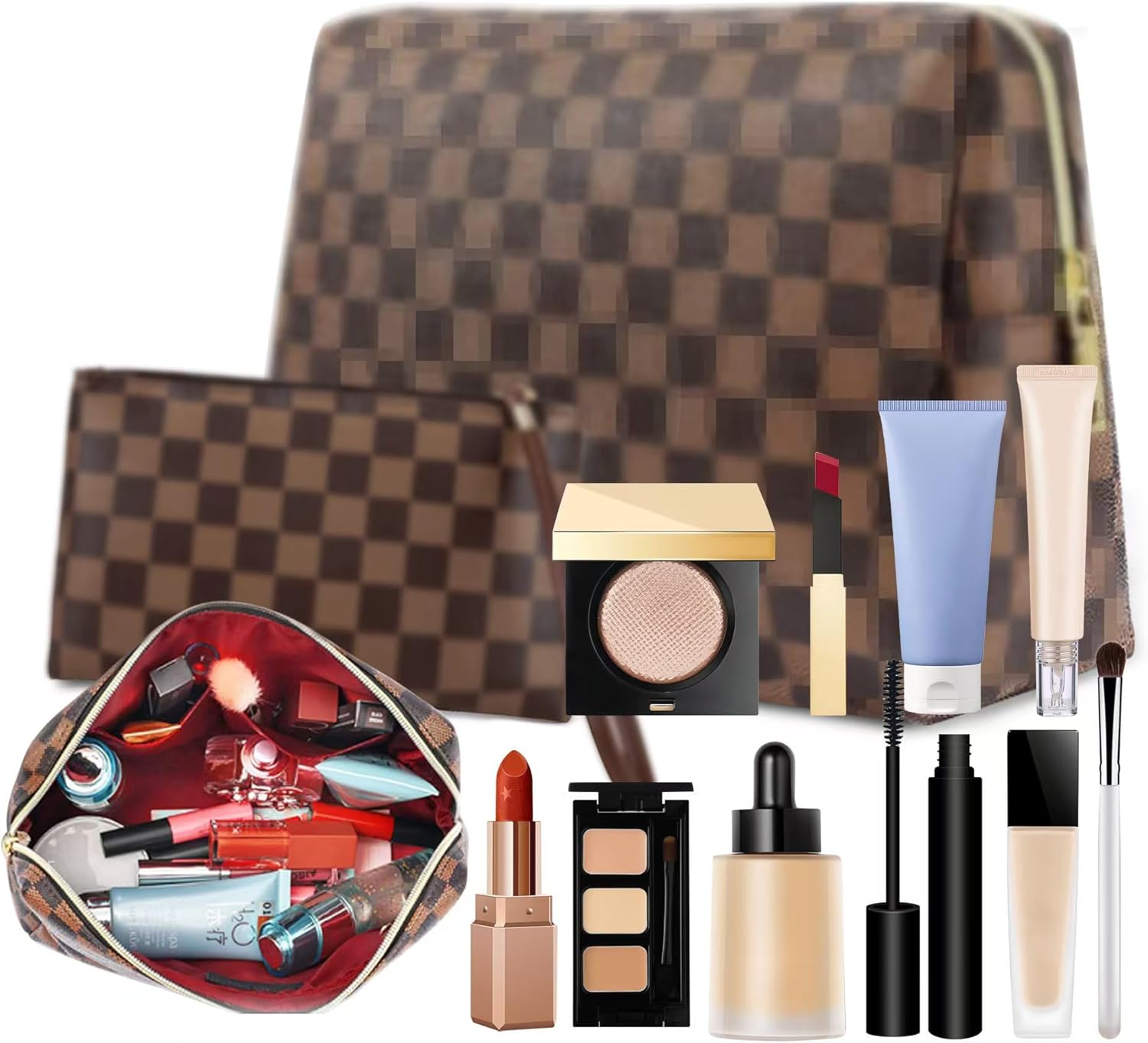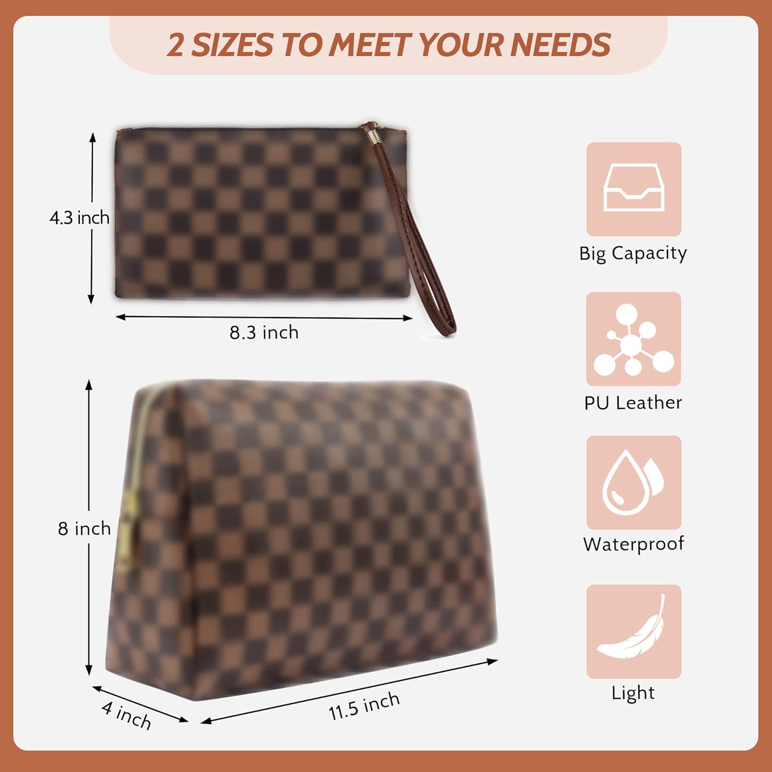 Makeup Bag, 2 Pcs Portable Leather Checkered Cosmetic Bag, Waterproof Travel Toiletry Bag for Women Gift