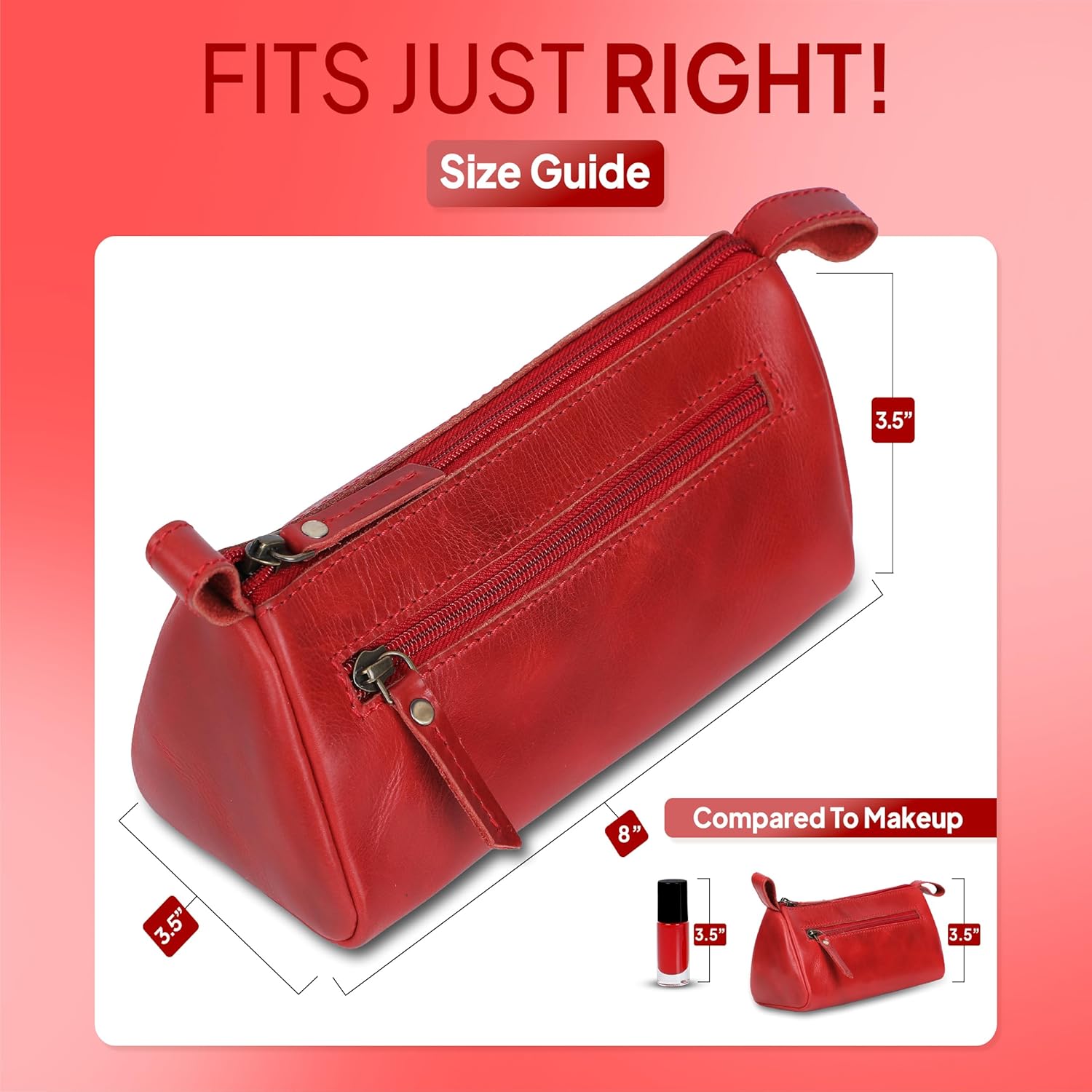 - LUXURY RED DESIGN – This Red leather cosmetic bag for women and men exudes natural charm with its rich hue and vintage-inspired finish. A compact yet elegant solution, it functions as a leather makeup bag for purse or weekend luggage with lasting appeal and utility.