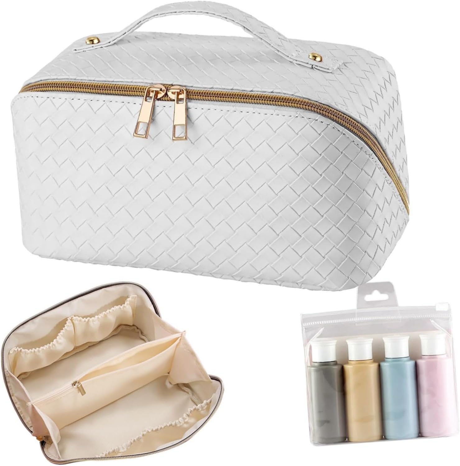 Waterproof Makeup Bag Large Capacity Travel Cosmetic Bag for Women with 4 Travel Bottles Set Waterproof PU Leather Travel Makeup Bag Organizer Portable Makeup Bags with Handle and Divider (white)